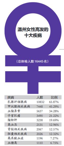 温州女性乳腺纤维腺病检出率高达65.9%。去年该院16445例女性体检结果中,有10832人检出有乳腺纤维腺病,位列温州女性高发疾病首位。