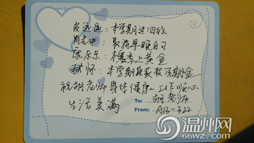 温州网讯(通讯员 易招娣)“要争取荣获奖学金”、“找到一个漂亮的女朋友”、“祝老师身体健康”......开学之初,不少温州大学步青学区的学生将自己本学期的学习、生活、交际等不同方面的打算和期许写在小卡片上送给了寝室导师,请校园里的“家长”共同督促和见证自己的目标和成长。