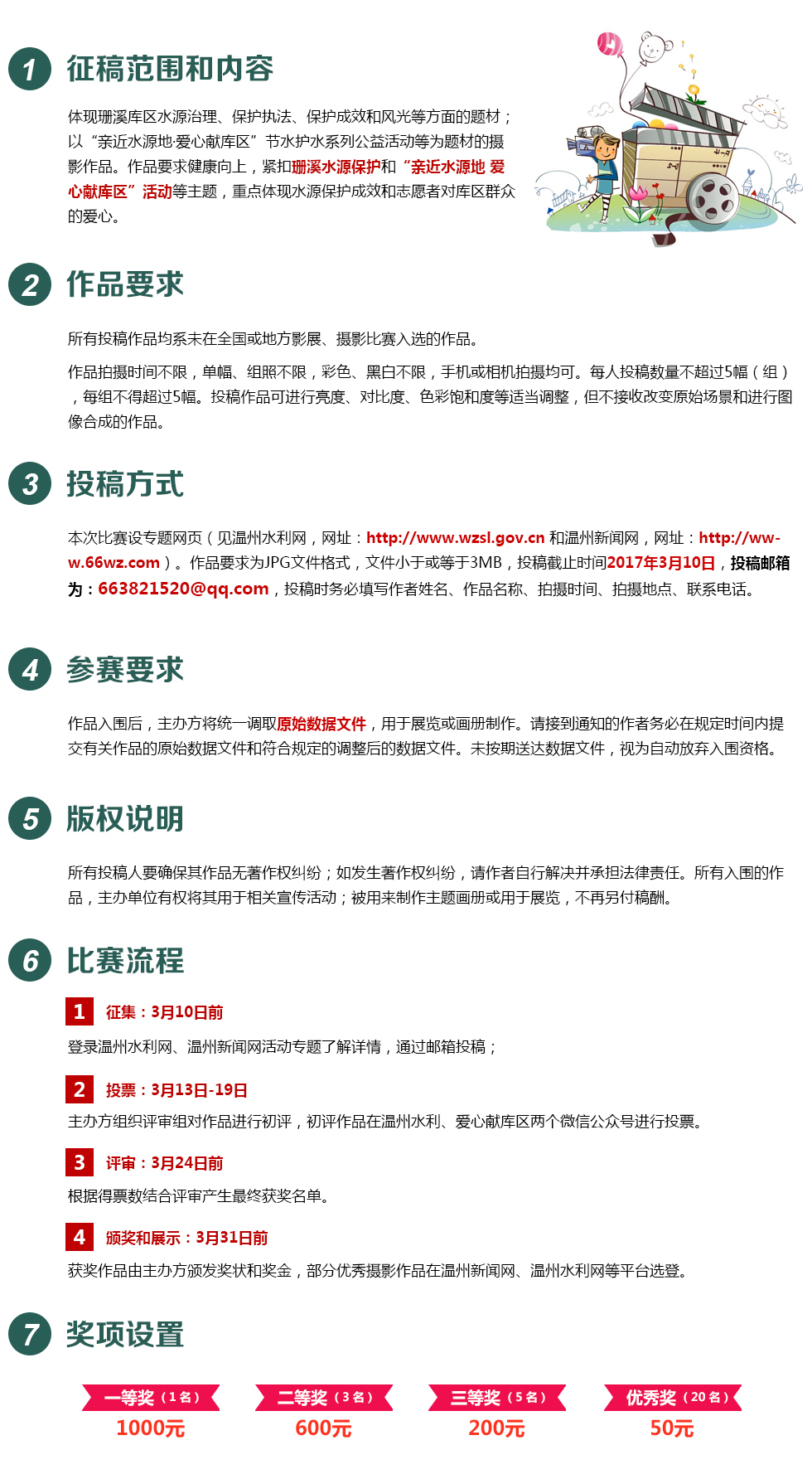 为迎接3月22日世界水日,宣传节水护水的环保理念,温州市水利局(珊溪水利枢纽管理办公室)决定于3月份举办“亲近水源地爱心献库区”公益志愿服务摄影比赛。