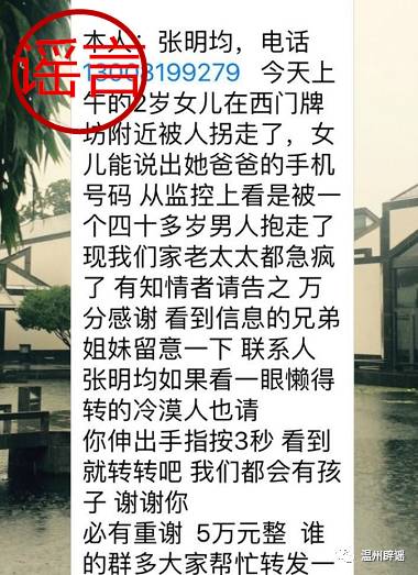 近日,瑞安市不少网民的微信群里转发着一条信息,称一名2岁女童在“西门牌坊附近”被人拐走,父亲叫“张明均”。有网民向辟谣君求证其真实性。