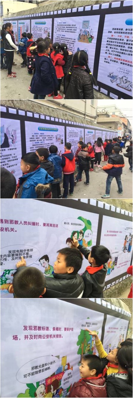 学校利用校园外墙制作了反邪知识宣传墙,用形象生动的图片及通俗易懂、简明扼要的文字向学生传授邪教的危害、邪教特点,防范邪害侵害的方法等反邪教知识,教育学生们遇到邪教人员纠缠及发现反宣品时,要及时向公安机关报告;在互联网上发现邪教宣传品时,要不看、不传、及时删除并报警;在接到宣传邪教内容的电话时,要不听、不信、不传,记住电话号码及时报警;家人和亲友被邪教迷惑时,要及时向公安机关或当地党委政府报告。