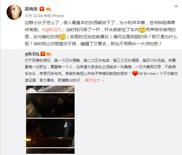 12日晚,陈羽凡在冲突事件发生后亲自发文:“感谢所有担心并给予声援和鼓励的朋友!All for love(介于你等伪造证据、夸大事实、欺骗群众的行为,日后再“偶遇”,不管是豺还是狗……)。”又表示:“当时我只挥了一杆,杆头就断在了车内,而声明中使用的图,反光镜处的洞(拍图时还放在前景处)请问这是我砸的吗?那又是为什么呢?当时我让你报警你不报,睡醒了又要去,那也不用再补一大点的吧?”胡海泉[微博]随后转发陈羽凡微博力挺,他写道:“这群小伙子怎么了,做人最基本的东西都放下了,为小利弃本善,世间种因得果终有报。”