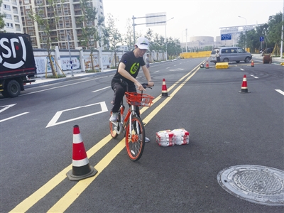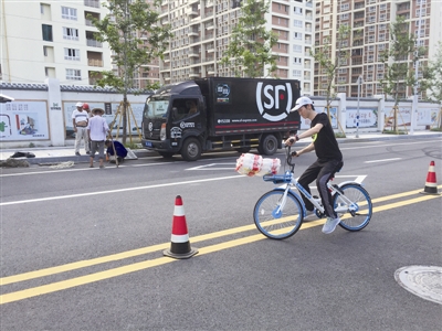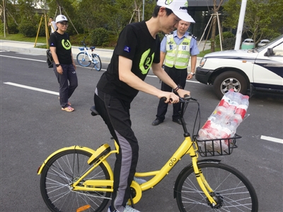 在车筐无负重的情况下,实验人员骑着哈罗单车绕行三角锥,进行转弯测试。记者看到,在无负重的情况下,哈罗单车在转弯时还是十分灵活的。