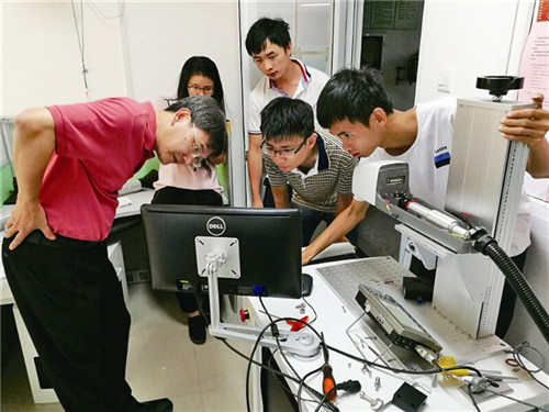 洪明辉院士(左一)在温大实验室指导搭建激光彩色标刻系统受访者供图