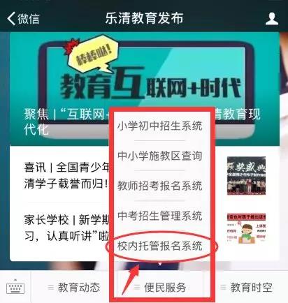明日(8月29日)起,校内托管服务可由学生和家长通过“乐清教育发布”微信公众号进入校内托管服务平台报名、缴费,服务内容主要安排学生做作业、自主阅读、体育、艺术、科普活动、社团及兴趣小组活动等,并对个别学习有困难的学生给予辅导帮助。