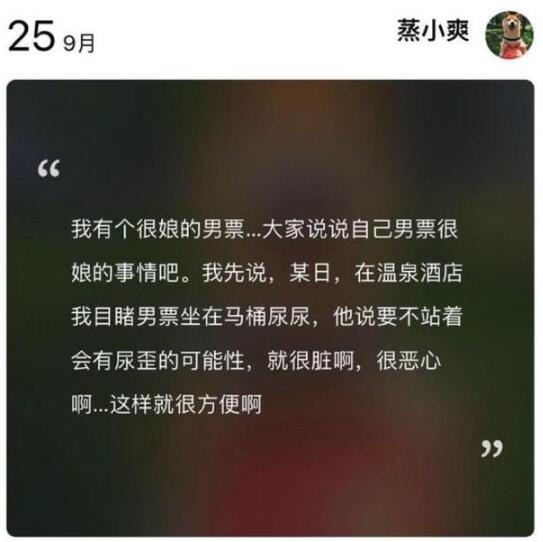 9月25日,郑爽在雪糕群里首度公开承认男友,并调侃自己的男票很“娘”。她分享了二人的一则趣事:“在温泉酒店我目睹男票坐在马桶尿尿,他说要不站着会有尿歪的可能,就很脏啊……这样就很方便”。但是这个举动却被网友骂惨。