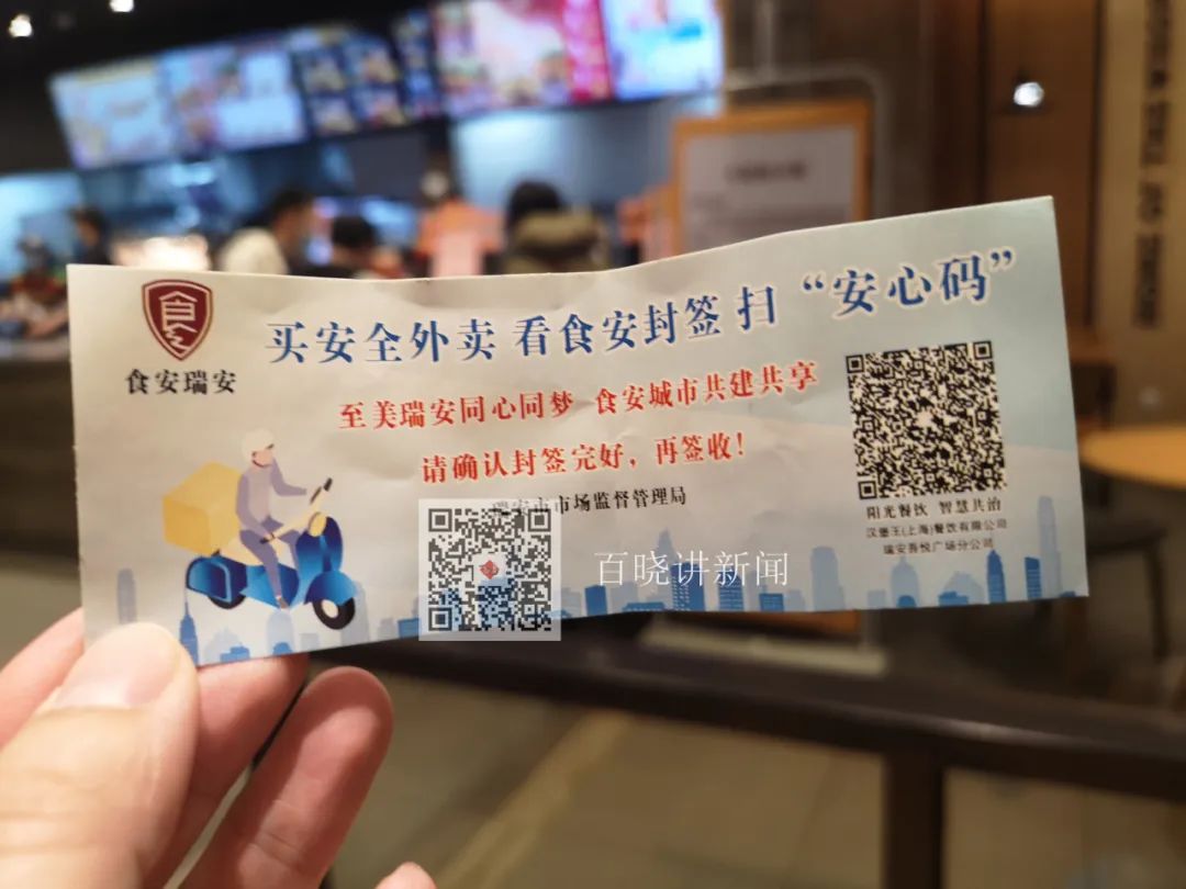 记者了解到,目前,瑞安吾悦广场首批参与“一签一码一卡”的网络订餐试点餐饮店共11家。现场,记者在这些餐饮店内看到,每家都备有食安封签。外卖员出发前都会贴上食安封签,而消费者取餐时,通过扫描安心码,就能轻松获知食品来源、外卖员即时体温等信息。