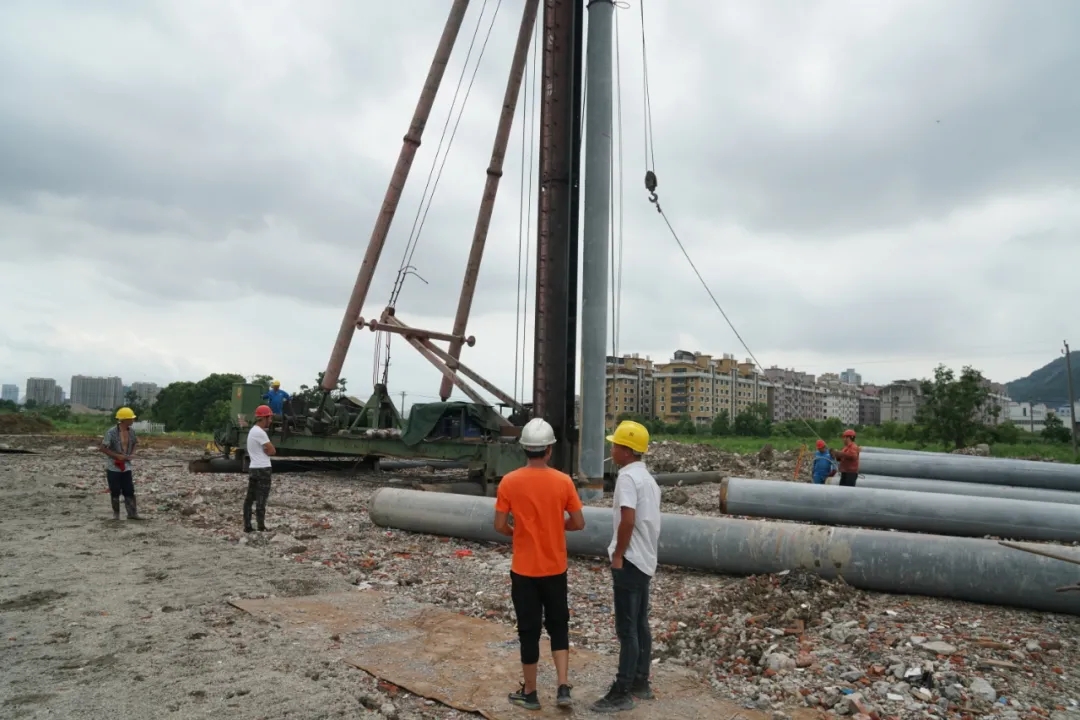 10余台挖机正在同步施工,土地清理、管道地埋、道路平整等项目建设正全力推进中,一侧打桩机正在全力施工中,砰砰砰的撞击声响彻整个工地,施工场面热火朝天。