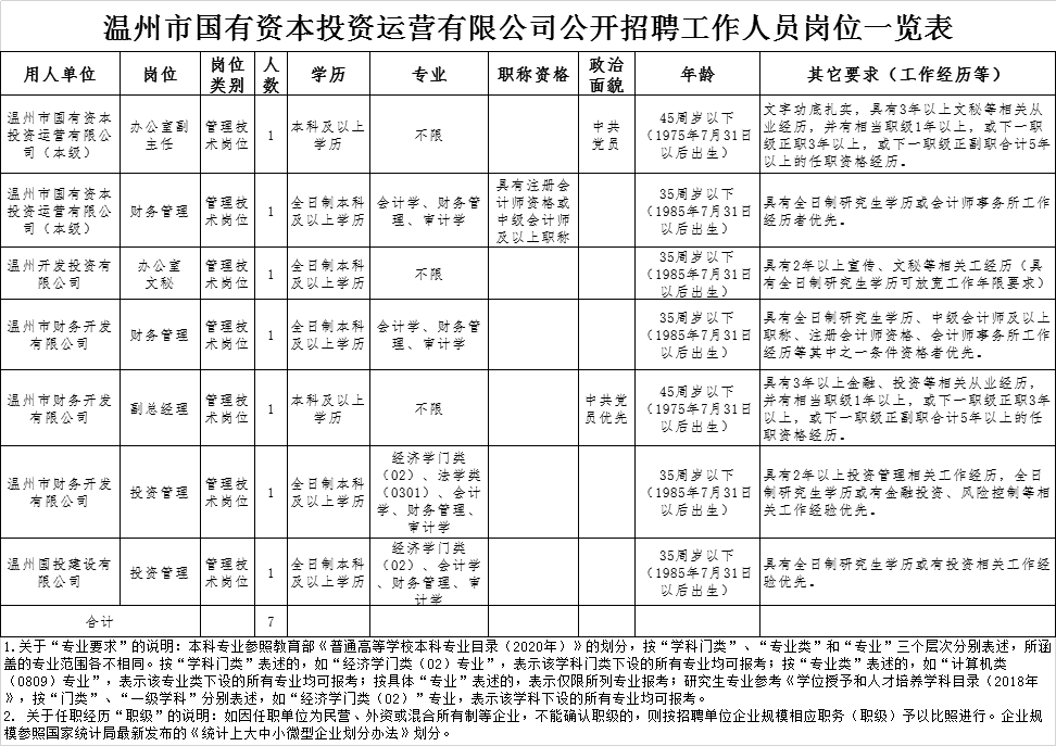 温州市国有资本投资运营有限公司公开招聘工作人员7名