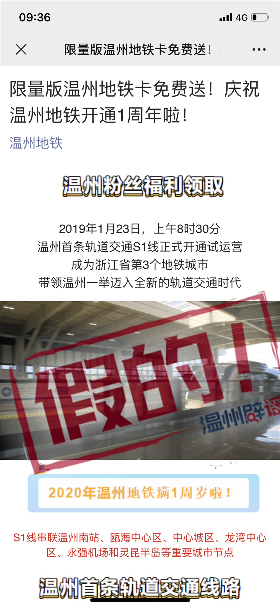 近日,在本地微信群、朋友圈流传着一则题为《限量版温州地铁卡免费送!庆祝温州地铁开通1周年啦!》的阅读链接和微信公众号软文。不少市民向温州辟谣求证,该消息是否为真。