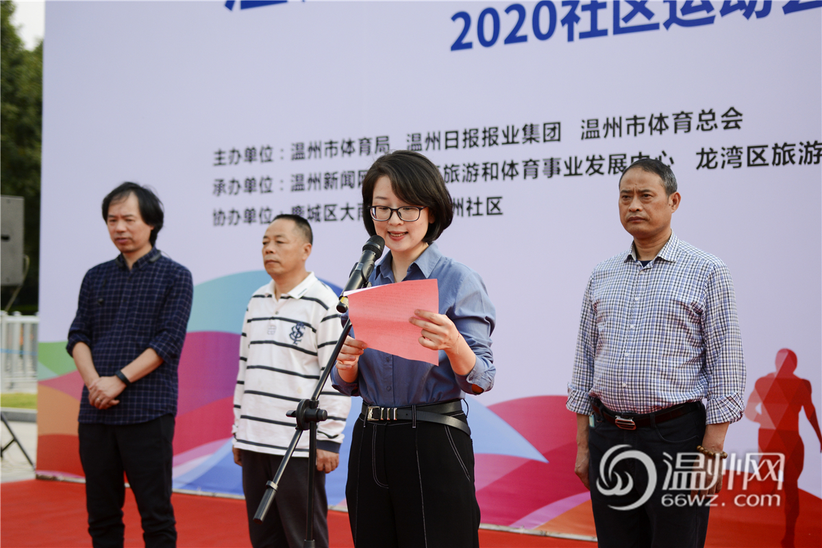 温州日报报业集团副社长、温州新闻网总编辑张春校讲话。2020温州市社区运动会将采用“线上线下”结合的形式,线上设置“全民酷跑赛”,邀请市民通过上传跑步里程数,决出一、二、三等奖;线下组织开展“社区巡回赛”,从11月开始,通过在鹿城、龙湾、瓯海、瓯江口等地开展开幕式、社区巡回赛,在12月初举行总决赛。