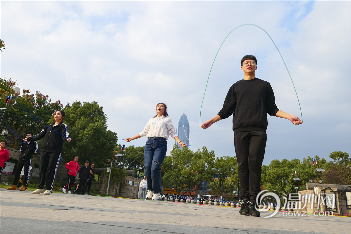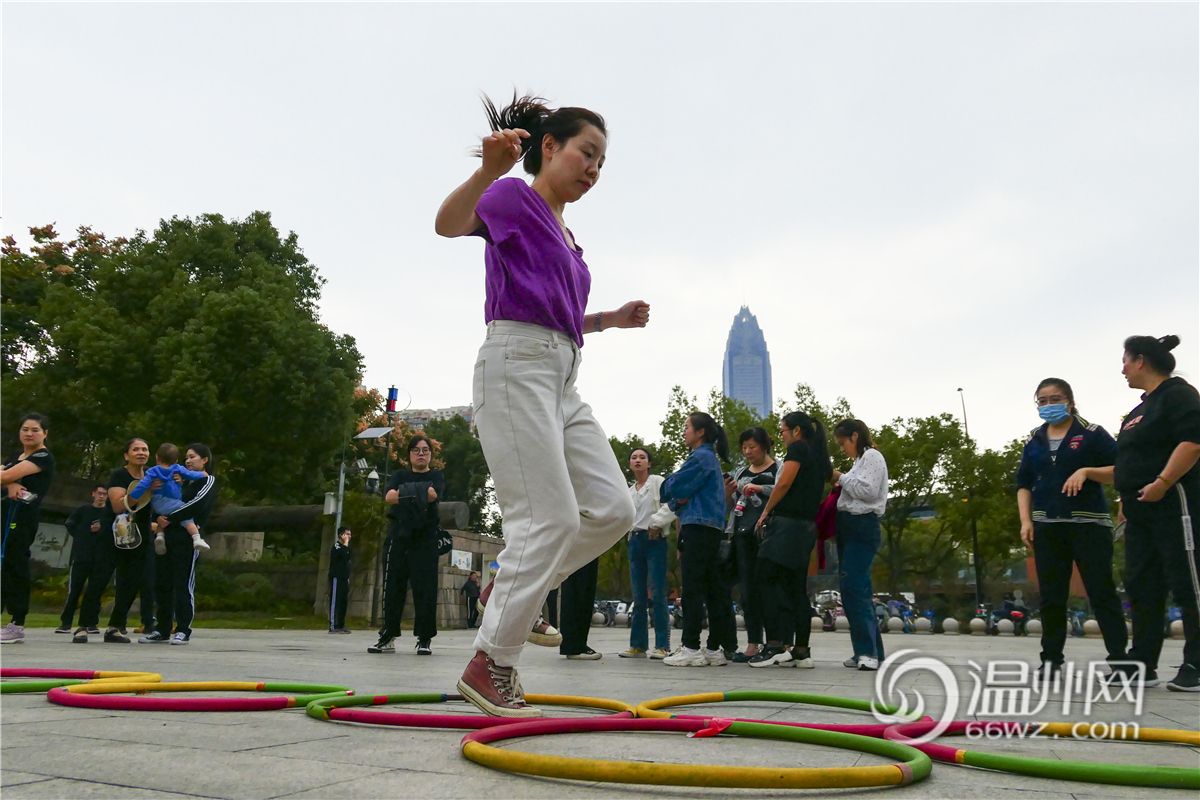 “2,1,1,1,2……”作为此次运动会的压轴项目,跳圈接力的现场也是十分热闹。错参赛选手边数数,边跳圈,直言这项比赛像小时候的跳房子。