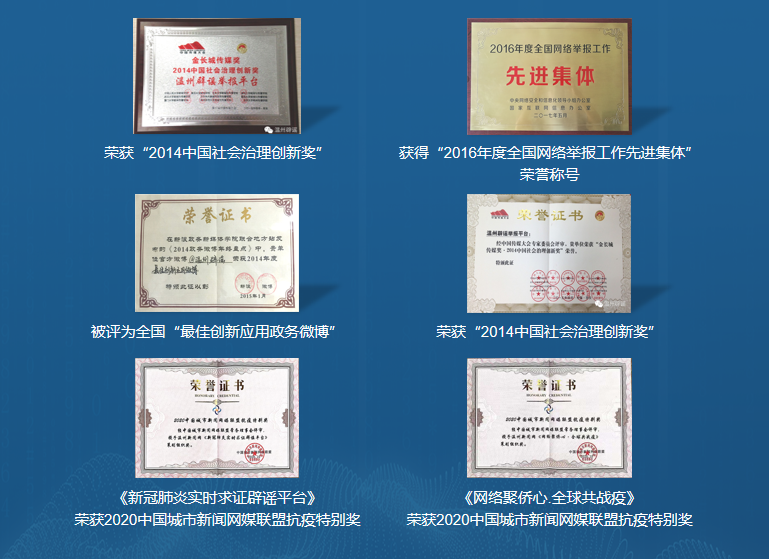 近年来,温州以创新打造温州辟谣举报平台为主抓手,着力构建政民企参与、专业化运作、规范化发布、全媒体覆盖的辟谣举报工作体系,在净化网络环境、清朗网络空间等方面取得了明显成效。目前,温州辟谣举报平台已累计发布辟谣信息8738条,其中涉温州的有899条,全媒体阅读量约4.72亿PV;是首批入选中国互联网联合辟谣平台成员单位的唯一地市级辟谣平台,被中央网信办授予“2016年全国网络举报工作先进集体”称号。