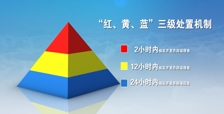二、“纵横联动”健全规范化辟谣机制,让真相跑赢谣言。在监测收集、核实查证、权威发布、造谣打击等环节同向发力、建章立制,健全辟谣联动工作机制,建立由辟谣联盟成员参与的联动监测机制以及红、黄、蓝三级辟谣联动发布机制,及时阻断谣言传播链条。