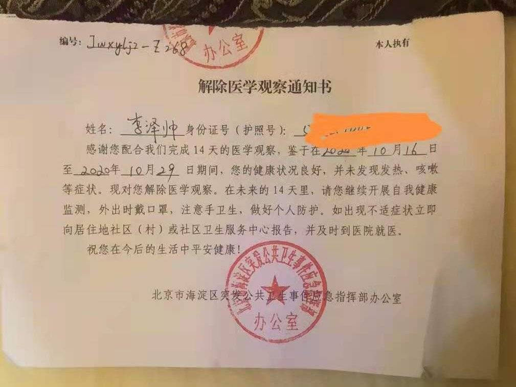 李泽帅,21岁,10月16日从加拿大回北京,10月16号至10月29号在北京集中隔离14天后,又在北京待了10天,于11月8日晚上从北京回到成都,均有核酸检测报告及隔离证明。11月8日至12月5日期间并未去过上述地区活动,并于12月6日凌晨4点多开车至南充,目前在南充回成都的高速上。