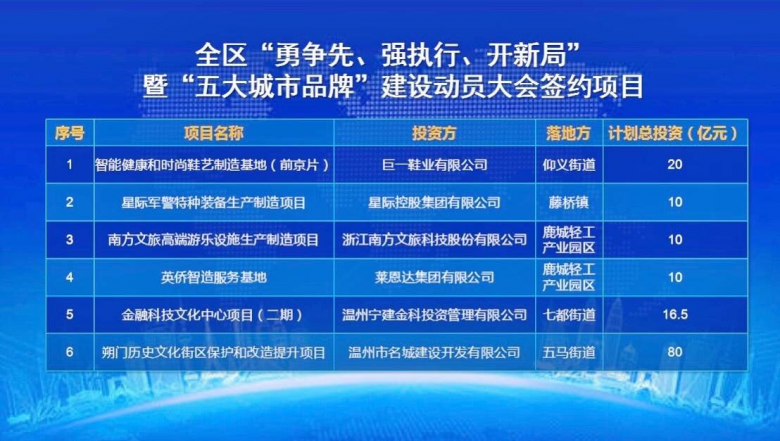 细数签约的项目,个个含金量十足,撑起了鹿城提升区域核心竞争力的“四梁八柱”。星际军警特种装备生产制造项目将配置研究院、技术中心、工业设计中心、博士后工作站、高技能人才工作室等创新机构,达产后年产值可达10亿元。英侨智造服务基地项目拟集聚盘活鹿城轻工产业园区制造资源,打造产品研发、展示、销售服务基地,为鹿城西部制造业提供完备的上下游配套,助推转型升级。