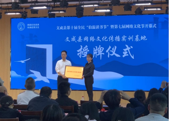 开幕式现场还举行了网络文化传播实训基地授牌仪式,文成县网信办为县新华书店等单位进行授牌。基地授牌后,文成将以基地为依托,组织开展系列网络文化传播实训活动,通过开展业务培训演练、网络文化传播作品创作活动等,提升队伍素质,推动在网上讲好文成故事,传播文成声音。
