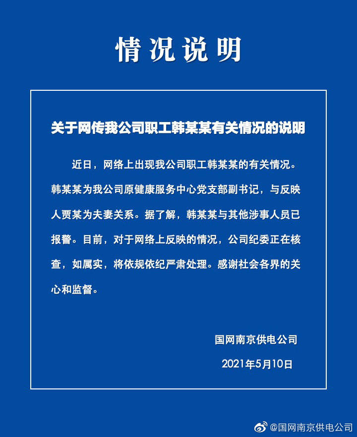 该举报信所言是否属实?5月10日傍晚,国家电网南京供电公司发布公告称,韩启明系该公司健康服务中心党支部副书记。目前南京电力公司正在对该事件进行核查。