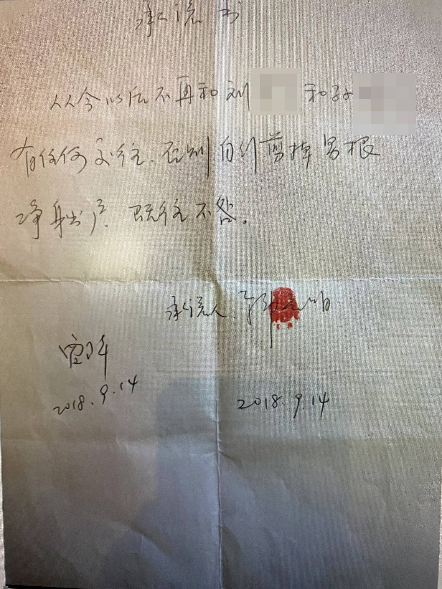 贾群给澎湃新闻提供了一份手写的承诺书照片,承诺书落款人为韩启明,并按下了红色指印。承诺书中写到,“从今以后,不再和刘芳某和孙某有任何交往,否则自行剪掉男根净身出户……”落款时间是2018年9月14日。