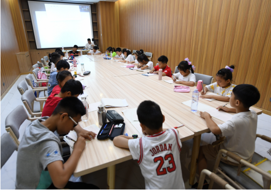 7月12日,苍南县新时代文明实践中心的爱心暑托班上,小学生在安静地做作业。