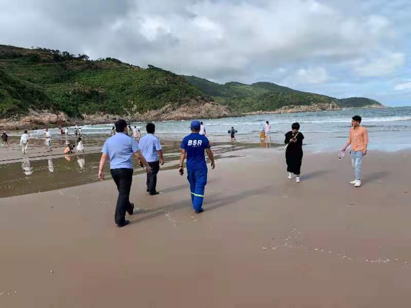 苍南霞关派出所民警在未开发的沛垒沙滩劝返前来游玩的游客,全力做好抗台工作。
