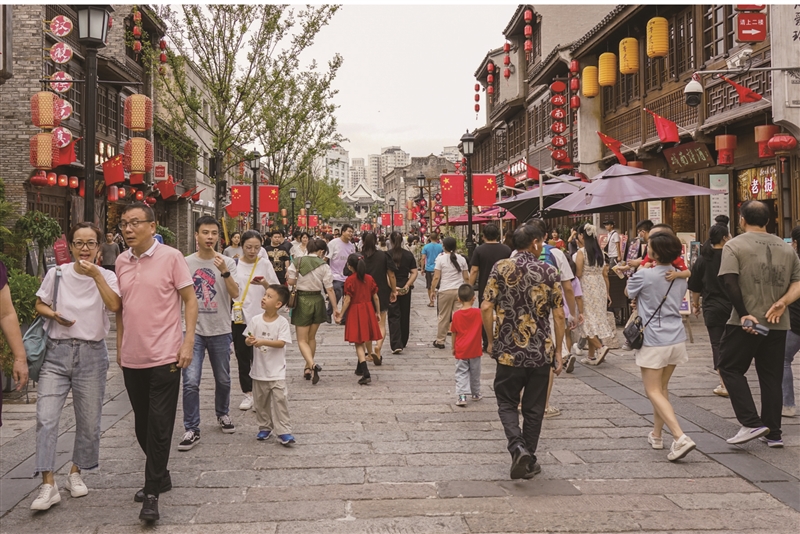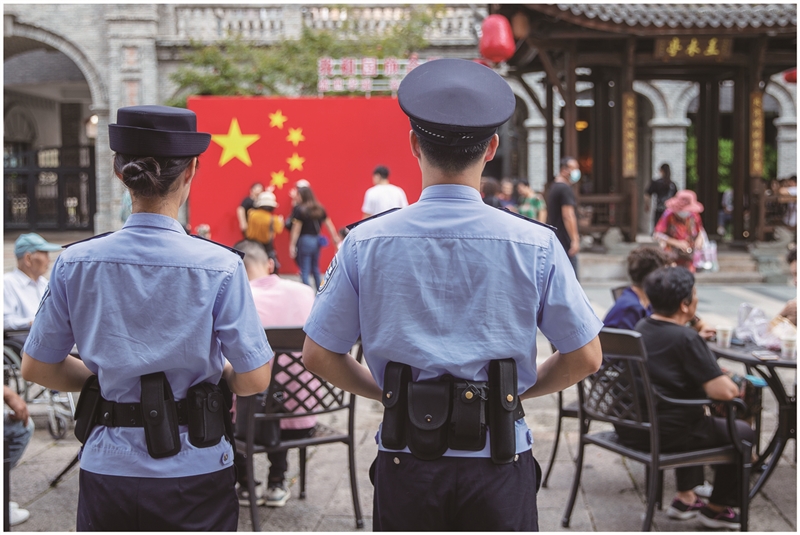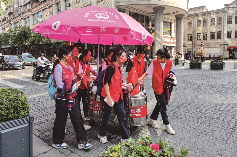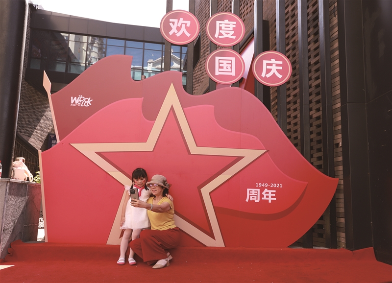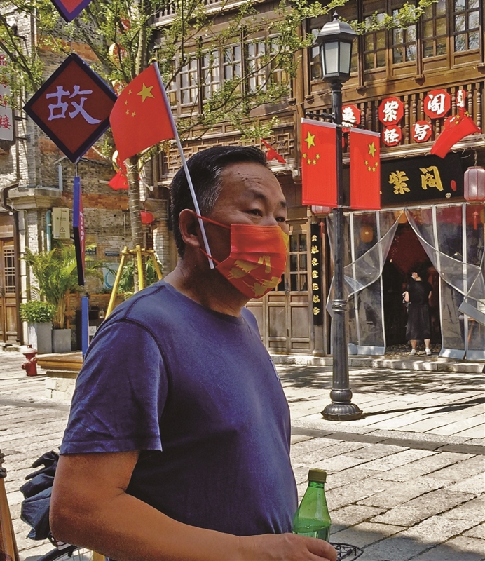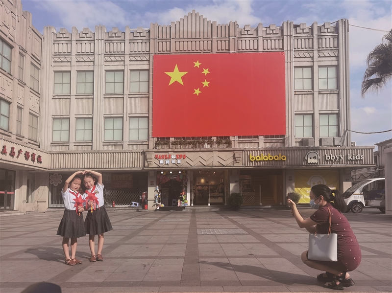 金秋的清风,吹动鲜红的国旗,那一抹最耀眼的中国红。走进五马历史街区,不少人排队等候,就为了和那一抹最鲜艳的五星红旗合影;还有不少中学生放弃难得的休息,戴上喜庆的红口罩,穿着红色的志愿者马甲走上街头做公益,推着凉茶车走街串巷,将一杯杯热茶送到市民的手中,俨然成了温州城最靓丽的风景线;飞翔体育运动俱乐部的一群孩子们,用羽毛球摆出“五角星”以及“国庆快乐”的字样,以自己最特别的方式喜迎国庆;此外,在国庆长假,公安、武警、医护人员、公交驾驶员……默默坚守在岗位的,他们用行动向祖国深情表白。