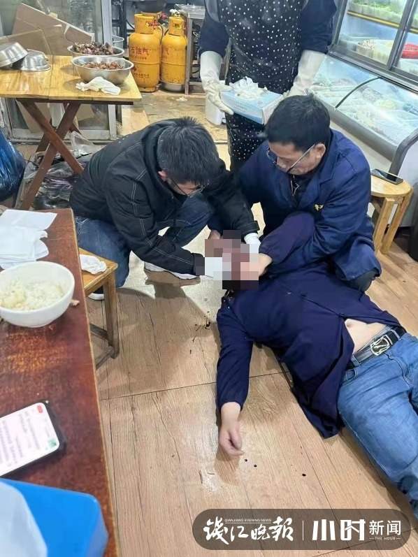 11月27日晚8点左右,衢州市龙游县人民医院护士叶辰辉带着妻子女儿在外散步,路过一家餐馆时,看到外面站着几个人,神色慌张,又听到有人在打电话提到人民医院,就往里面望了一眼,发现有人躺倒在地上,嘴边都是血。叶辰辉二话没说,冲进去帮忙。