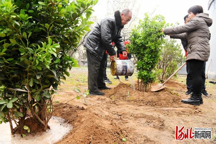 2022年3月30日,在河北省广平县革命烈士陵园,烈士后代和广平县退役军人志愿者一起以植树的方式悼念革命先烈。通讯员程学虎摄影报道