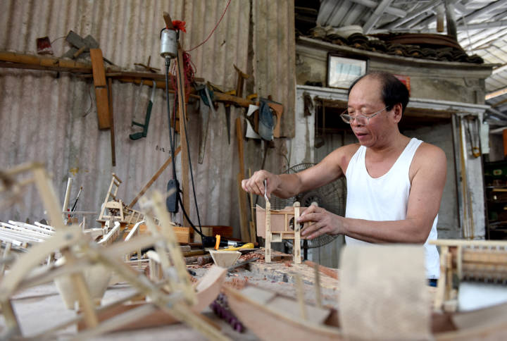 戴一副眼镜,穿着背心短裤,手握凿刀正聚精会神地雕刻首饰龙上迷你水车的零部件。初见林顺奎,记者觉得他朴素的形象与其他手艺人相差无几。交谈后发现,他年逾花甲却精神矍铄。