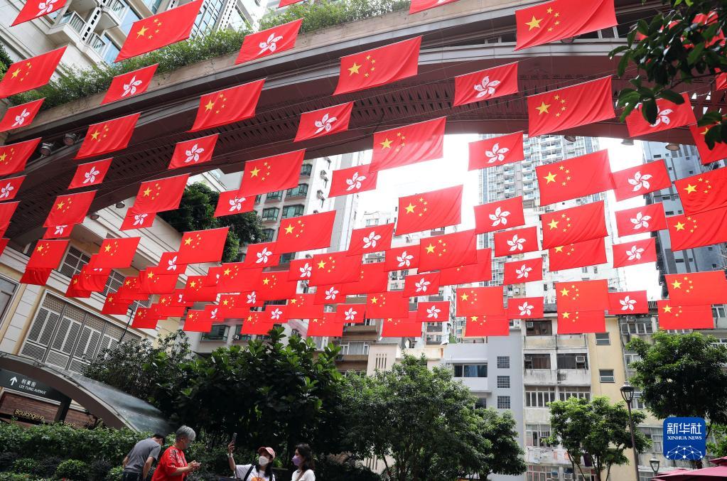 香港回归祖国25周年临近,香港街头喜庆气氛渐浓。图为在香港利东街,中华人民共和国国旗和香港特别行政区区旗迎风飘扬(6月16日摄)。新华社记者 李钢 摄