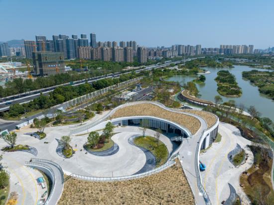 三垟湿地西北入口位于瓯海大道与惠民路交叉口,项目设计理念来源于三垟湿地三宝之一的“菱角”,地上建筑造型由东西两栋两层弧形主体外加中间钢结构天桥相连,营造出“双菱抱月”的景观效果。