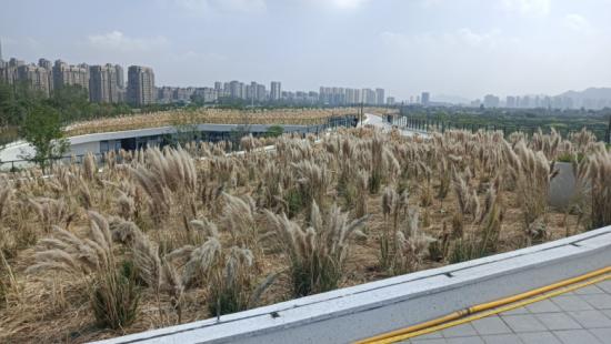 湿地阳台之上,大片大片的蒲苇形成了壮观的景色。园林工作人员介绍,蒲苇作为三垟湿地的特色植物,他们特地从三垟湿地内大量移植到湿地阳台,浓密的柔毛在风中摇晃,满眼的淡黄色带来一种丰收的气息。