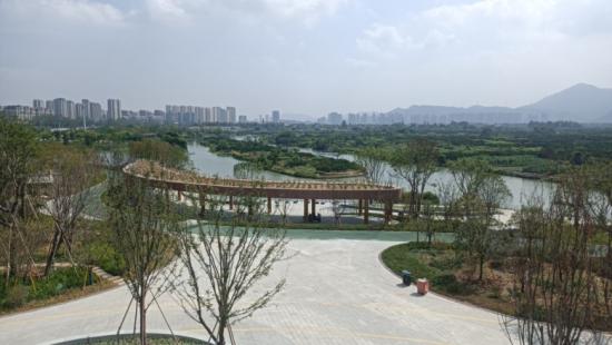 除了观景台外,三垟湿地西北入口还设置了沿河绿道,沿途开拓了数个供游客休息游玩的廊亭、广场。这条绿道一直向东延伸,今后将会连接到五福源,再连接到温州生态园三垟湿地景区处。