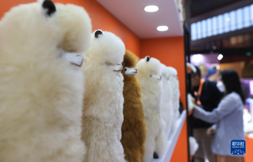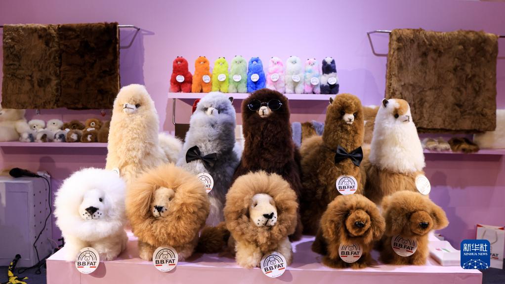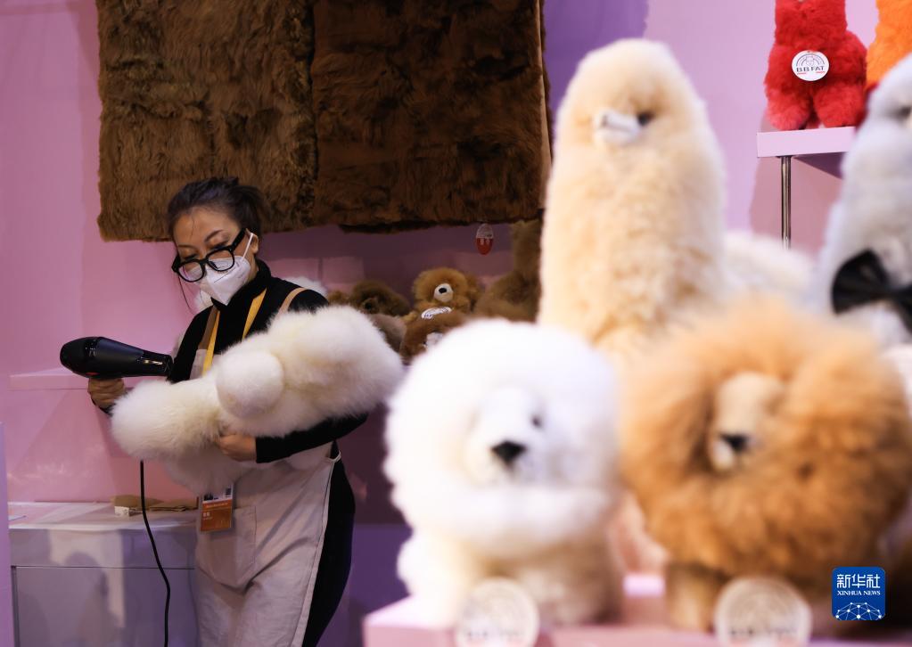 在第五届进博会上,来自澳大利亚、新西兰和秘鲁的展商“不约而同”展出羊驼毛制品,蓬松柔软、形态各异的动物玩偶在展台“列队”,吸引大批观众前来交流洽谈,为进博会增添一抹可爱的亮色。新华社记者 戴天放 摄
