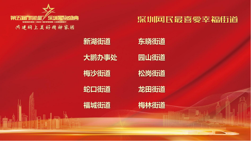 读特客户端·深圳新闻网2022年12月29日讯 第五届深圳网络盛典,评出了“2022年深圳网民最喜爱幸福街道”和深圳区级融媒体优秀传播平台。
