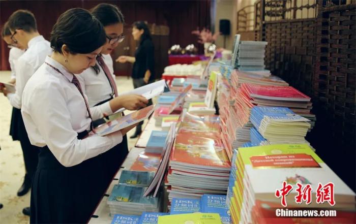 努尔苏丹(现阿斯塔纳)当地中学生在阅读汉语教材。文龙杰 摄