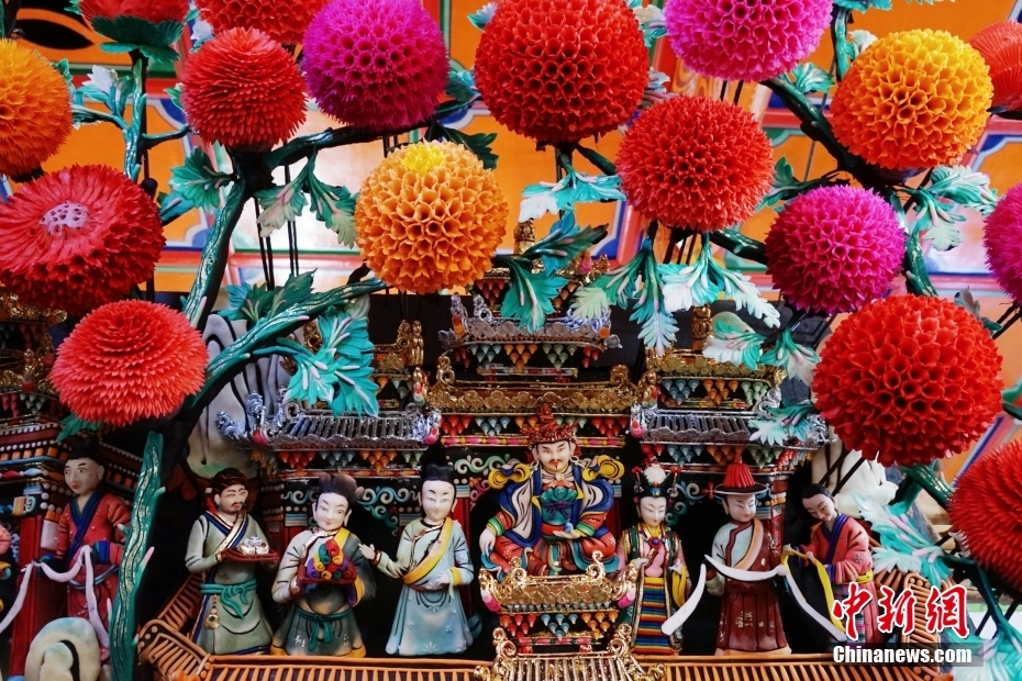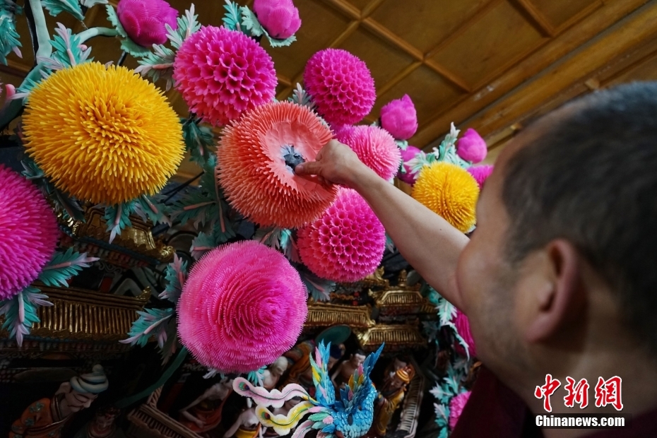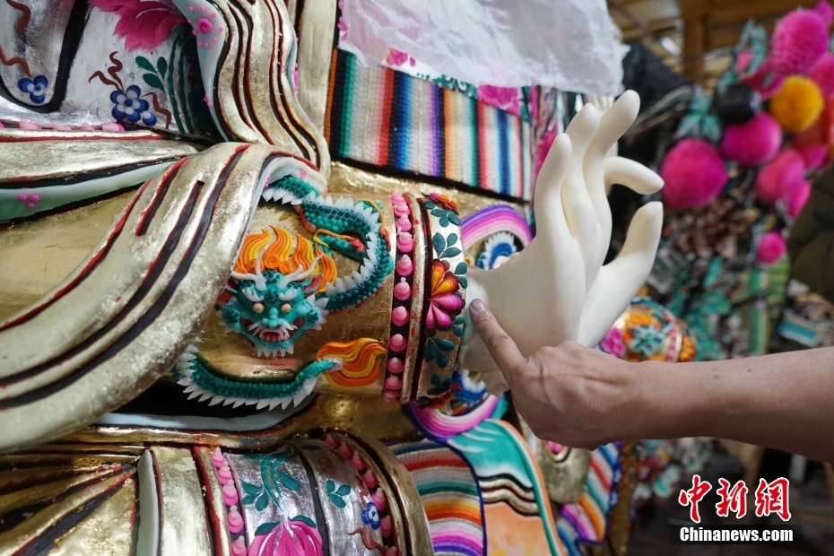 2月1日,在位于青海省西宁市湟中区境内的藏传佛教名刹塔尔寺内,艺僧为酥油花主佛做最后修饰。