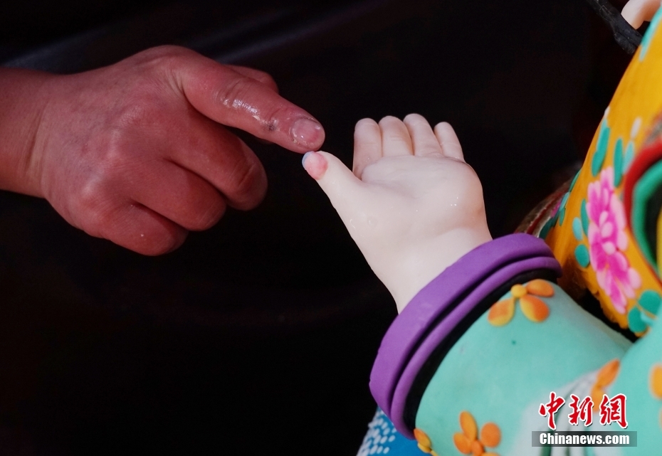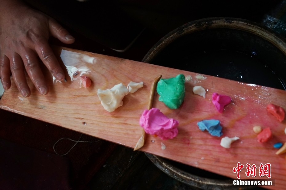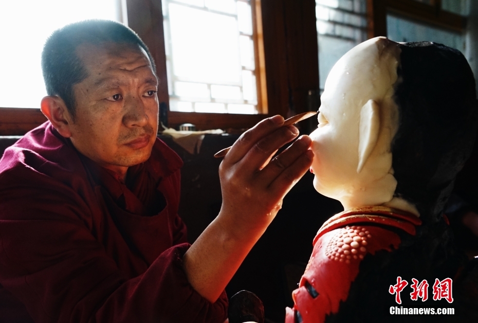 2月1日,在位于青海省西宁市湟中区境内的藏传佛教名刹塔尔寺内,艺僧搓揉酥油成条状。