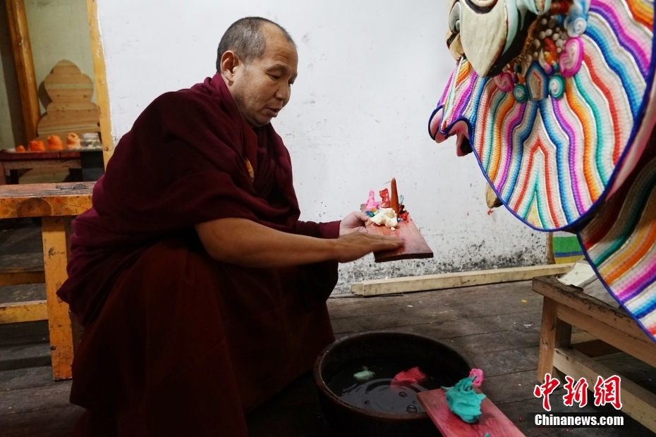 2月1日,在位于青海省西宁市湟中区境内的藏传佛教名刹塔尔寺内,艺僧正在制作酥油花。