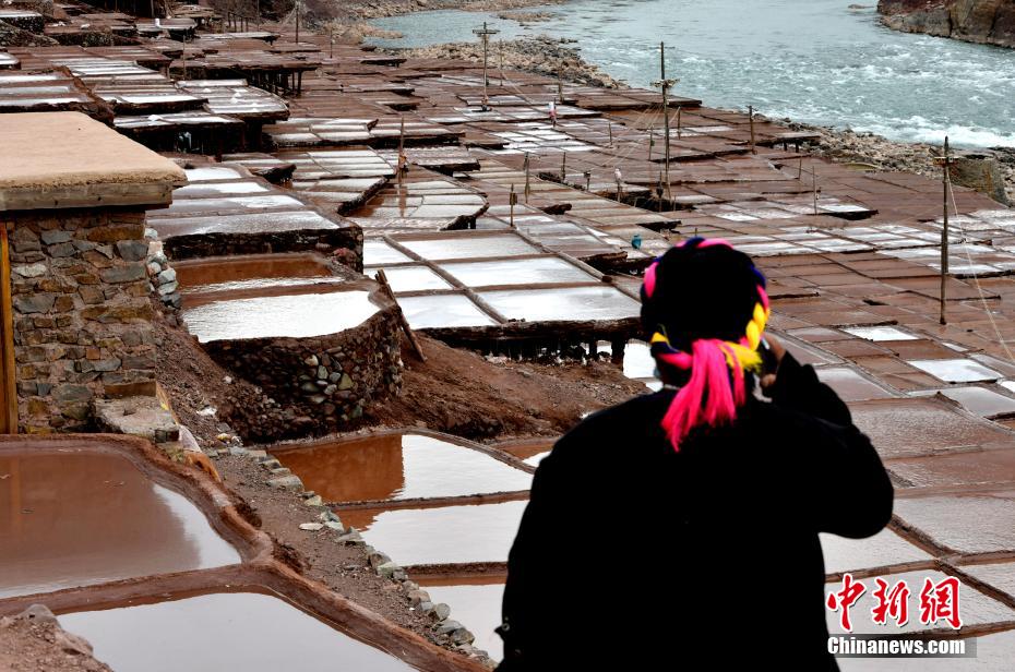 2月13日,西藏昌都芒康县纳西民族乡加达村村民俯瞰古盐田。李林/摄