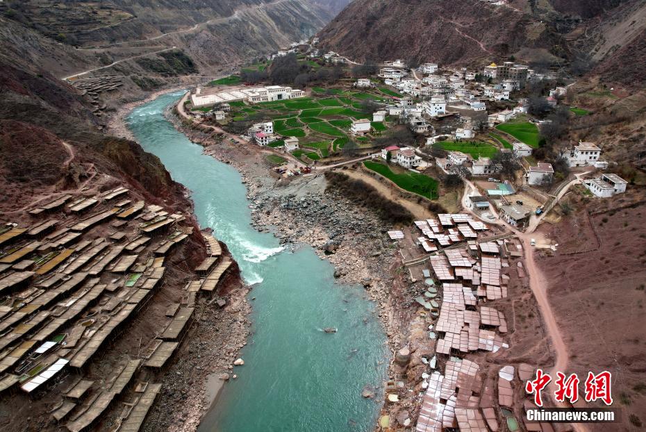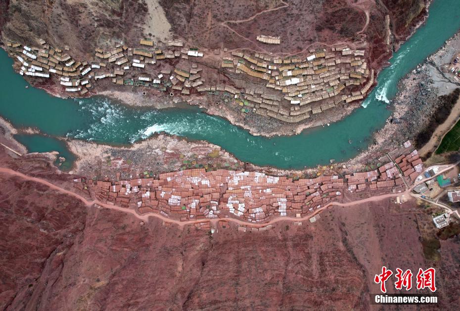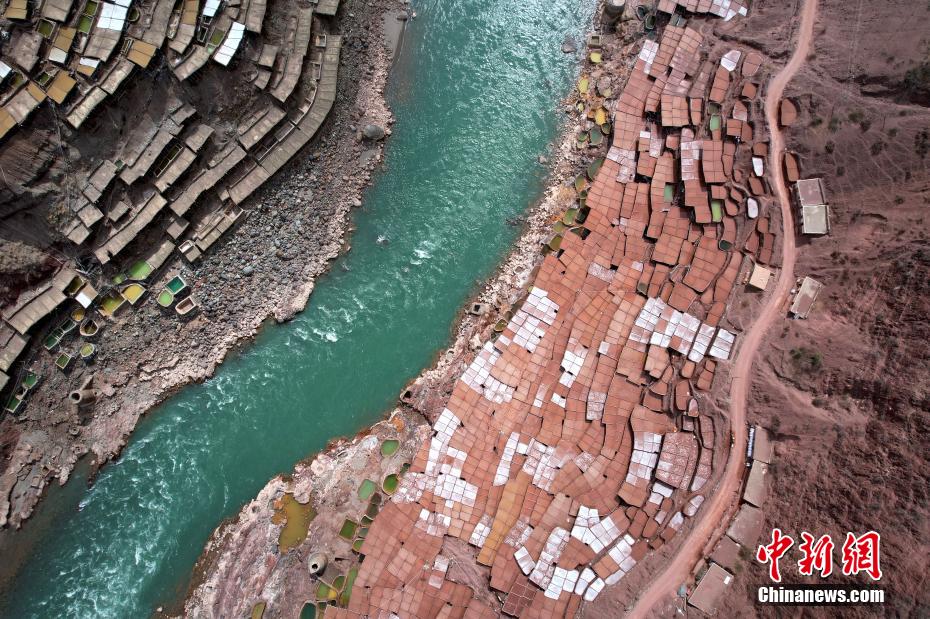 在西藏昌都芒康县纳西民族乡澜沧江两侧,有一处古老的、大大小小数千块盐田。史料记载,当地晒盐历史距今已有1000多年。木柱搭建的盐田,高低错落,依河谷山势,在临江两岸蔓延。当地民众从江畔的盐井、盐池中抽出卤水,引入盐田,经过阳光与风的杰作,结晶成盐。进入盐田,房内顶部到处悬挂钟乳状晶盐,仿若“水晶宫”的世界。图为2月13日,西藏昌都芒康千年古盐田。(无人机照片)李林/摄