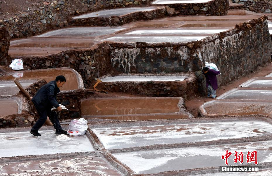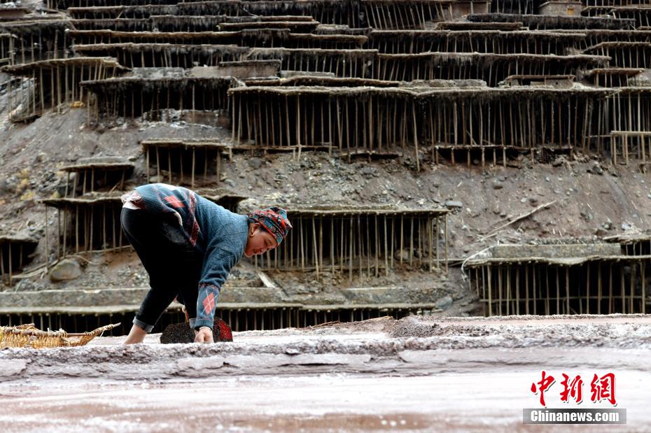 2月13日,西藏昌都芒康县纳西民族乡加达村村民珍罗正在扫盐。李林/摄