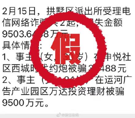 微信群流传的截图显示,“2月15日,拱墅区派出所受理电信网络诈骗共2起,损失金额9503.6488万元。具体情况:1、事主 (女,30岁) 在申悦社区西城时代约炮被骗36488元;2、事主 (女,24岁) 在运河广告产业园区万达投资理财被骗9500万元。” “24岁为什么资产近亿?”“流下了心疼自己的眼泪!”消息出现后,不少人对涉案金额之大表示震惊。不过,也有网友分析“感觉像假的,没有指出是拱墅区的哪个派出所”还有网友敏锐洞察后指出,警方不会使用“约炮被骗”这样的表述。