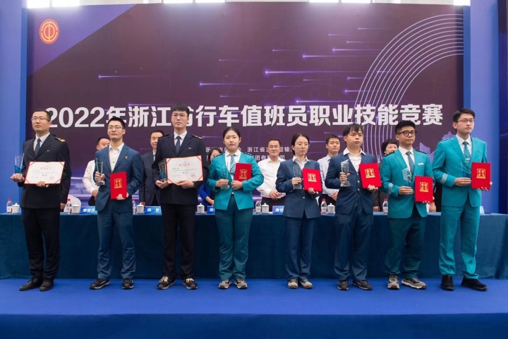 周翱鸥(右一)在2022年浙江省行车值班员职业技能竞赛颁奖现场。幸福轨道公司供图