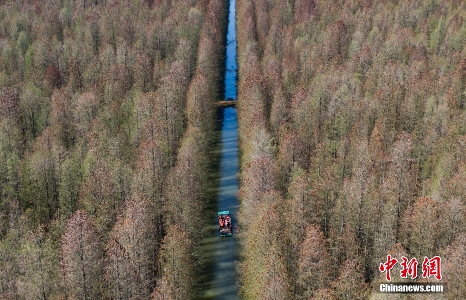 4月2日,江苏淮安,航拍金湖水上森林万亩水杉林。金湖水上森林景区总占地?积12000亩,是江苏地区规模最大的人工湿地生态林,从空中鸟瞰,生态怡人美如画。(无人机照片)