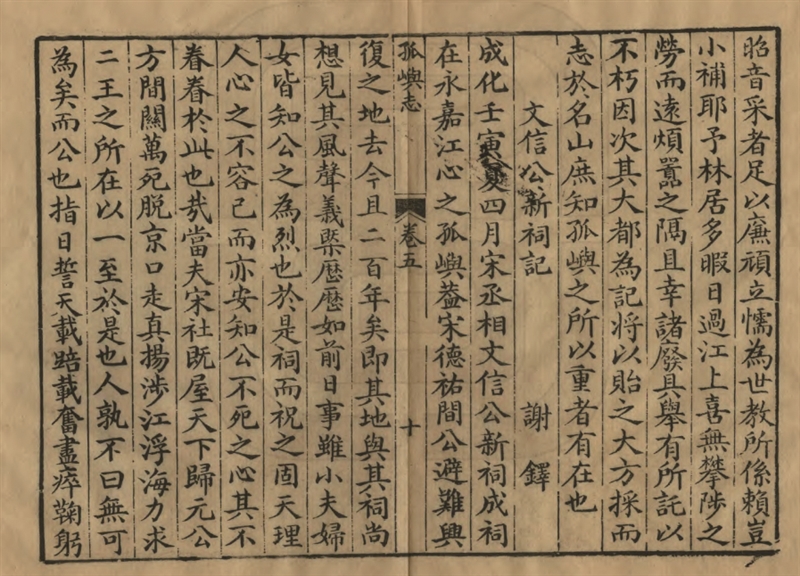 成化十八年(1482)是文天祥就义200周年。这一年,宋文信国公祠在江心屿落成,谢铎因父丧告假在家,应邀撰写了碑记《文信公新祠记》: