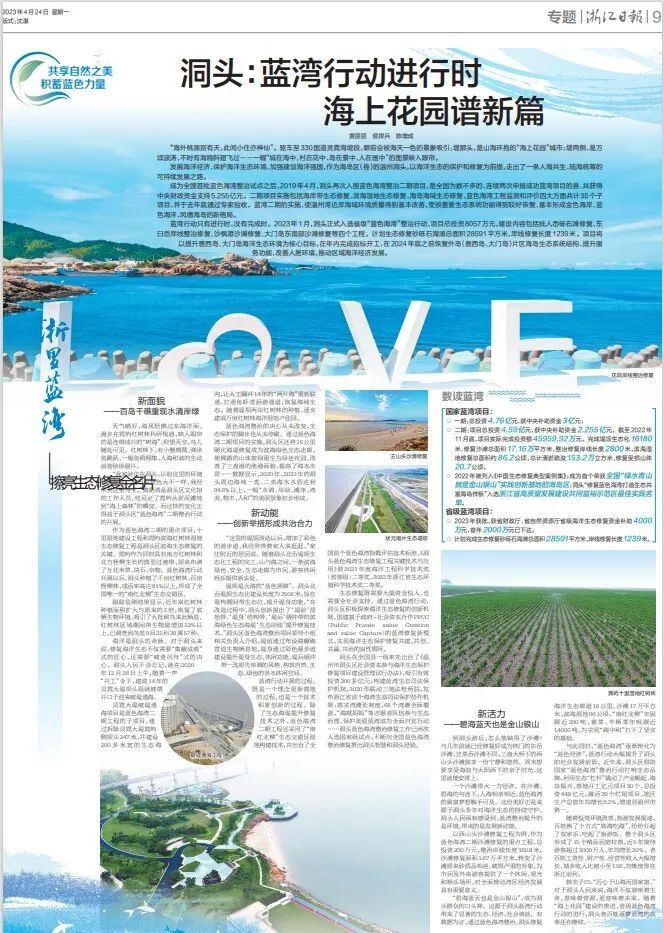 成为全国首批蓝色海湾整治试点之后,2019年4月,洞头再次入围蓝色海湾整治二期项目,是全国为数不多的、连续两次申报成功蓝湾项目的县,共获得中央财政资金支持5.255亿元。二期项目实施包括海岸带生态修复、滨海湿地生态修复、海岛海域生态修复、蓝色海湾工程监测和评价四大方面共计35个子项目,并于去年底通过专家验收。蓝湾二期的实施,使温州湾近岸海域环境质量得到基本改善,受损重要生态系统功能得到较好恢复,基本形成金色海岸、蓝色海洋、风情海岛的新格局。