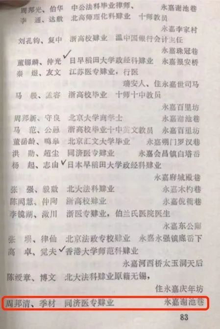 周季材,同济医专肄业后,曾任中国农民银行在温设办事处负责人。他和郑振铎是浙江省立第十中学(温州中学前身)同学。五四运动后,他曾参加进步组织“永嘉新学会”,以传播“新思潮、新文化”为宗旨,协助郑振铎创设救国讲演社,出版《救国讲演周刊》。