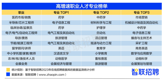 数据显示,医药市场/销售、半导体/芯片工程师等职业的高校毕业生需求增速高于全行业,榜单中职业的高校毕业生招聘增速均高于20%。通过统计这些职业人才的专业发现,药学、中药学是通往医药市场和临床协调高增长职业的“必由之路”,而电子信息、机械设计等复合型专业,则成为半导体/芯片职业的入职“基石”。
