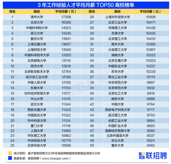 毕业院校影响着人才的职场起步与发展“钱景”。数据显示,“3年工作经验人才平均月薪TOP50高校榜单”中,仅有2个高校是“双非”院校。